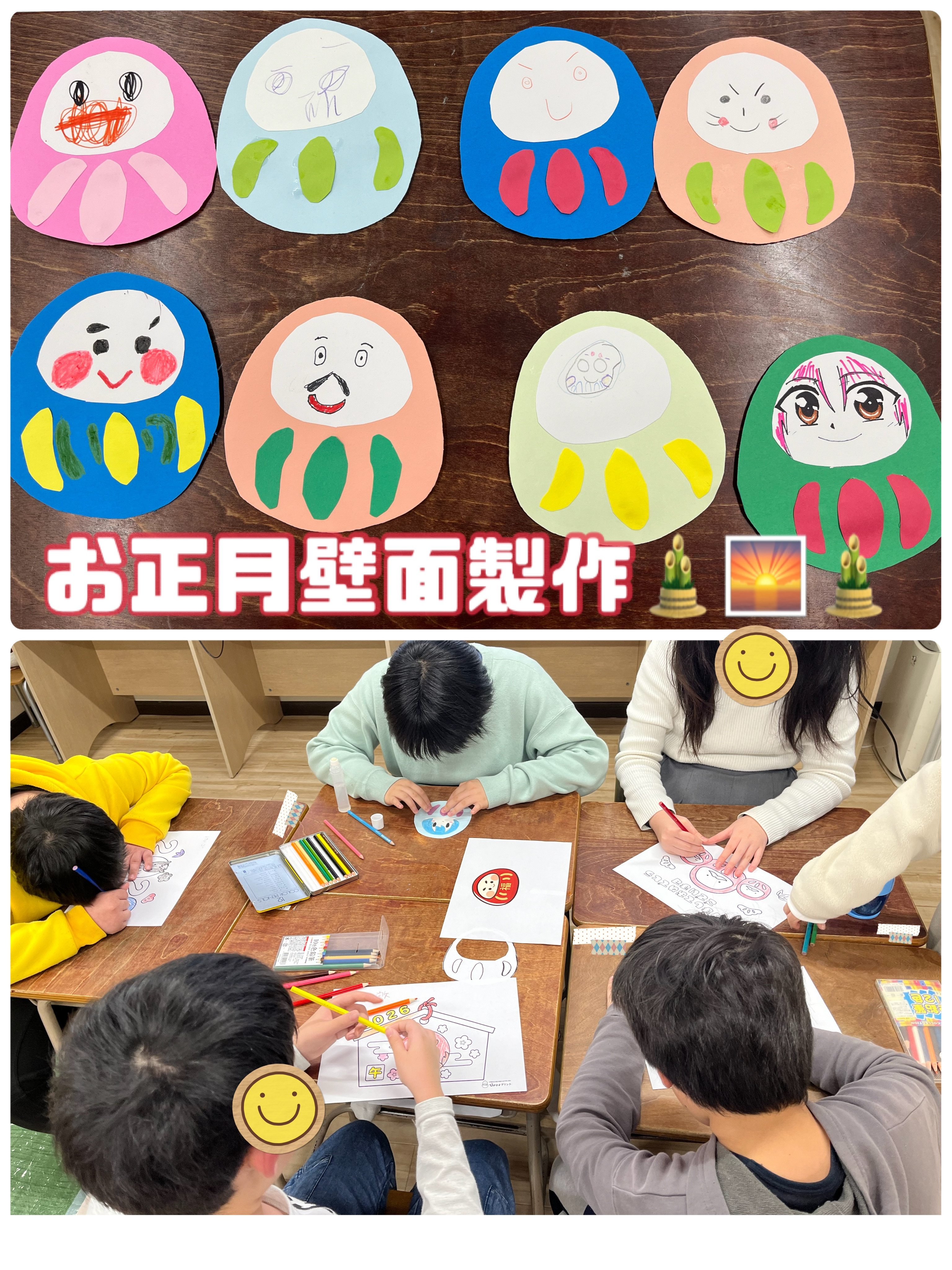 療育室をお正月仕様にするため、壁面飾り製作に挑戦しました。