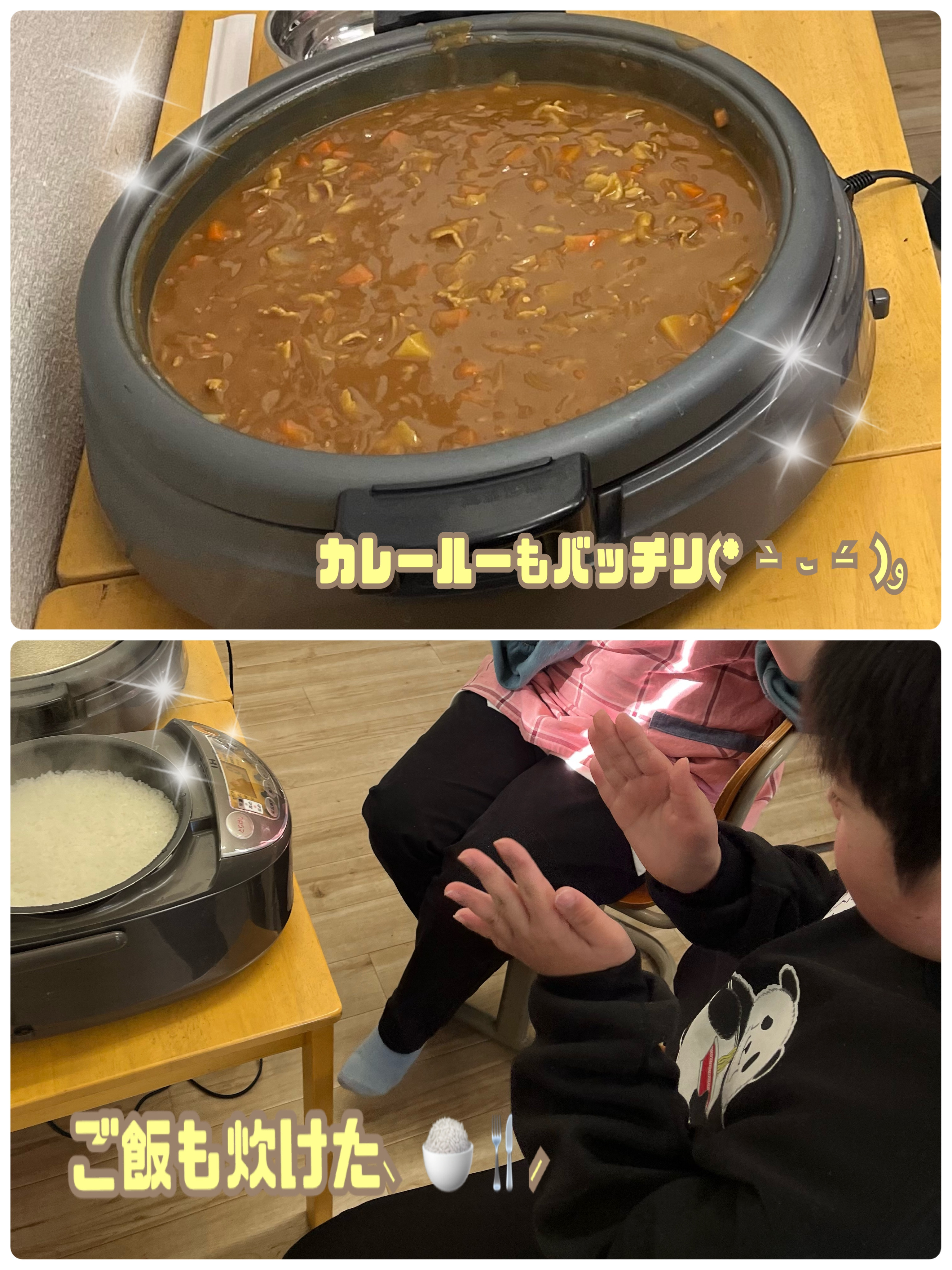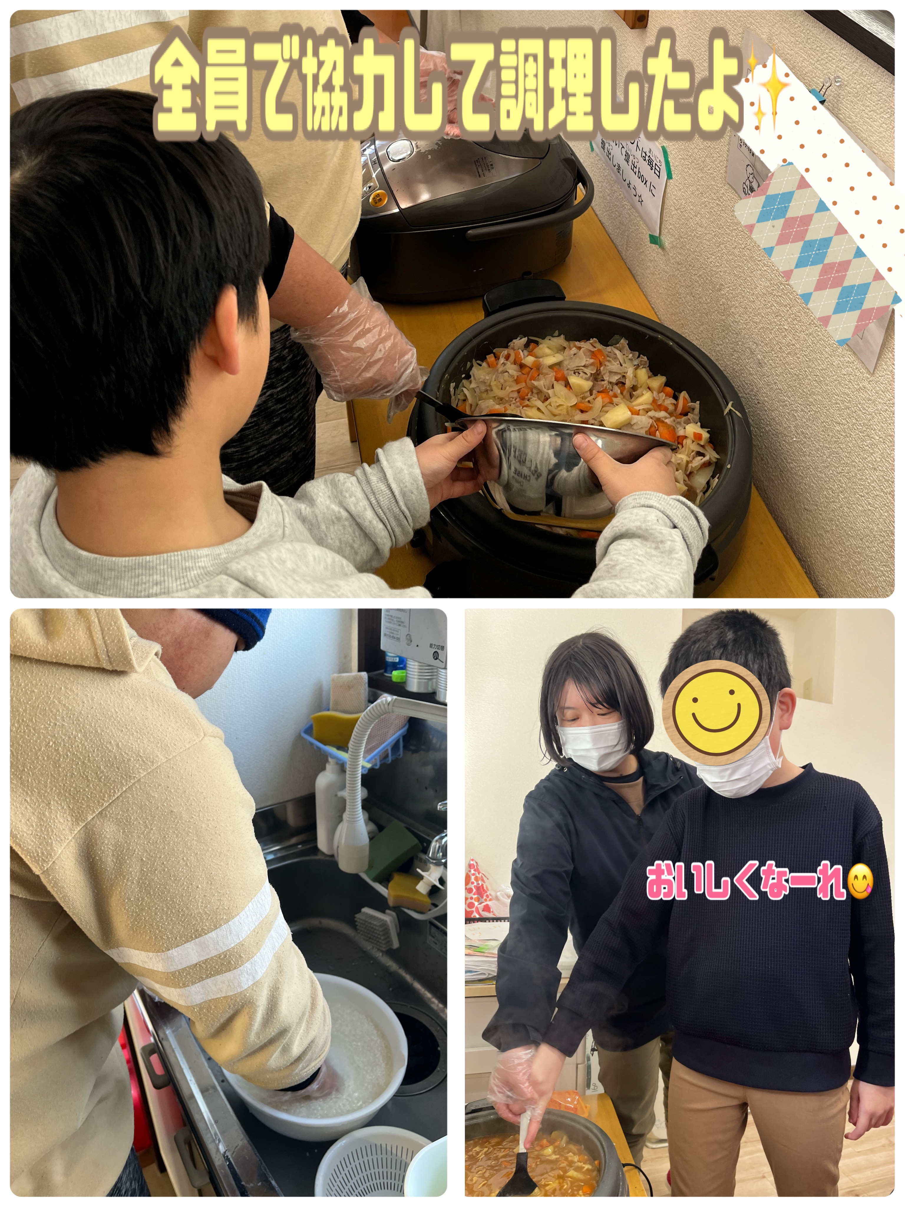 「先生、人参どう切ったらいい?」「お米研ぎ終わりました!」